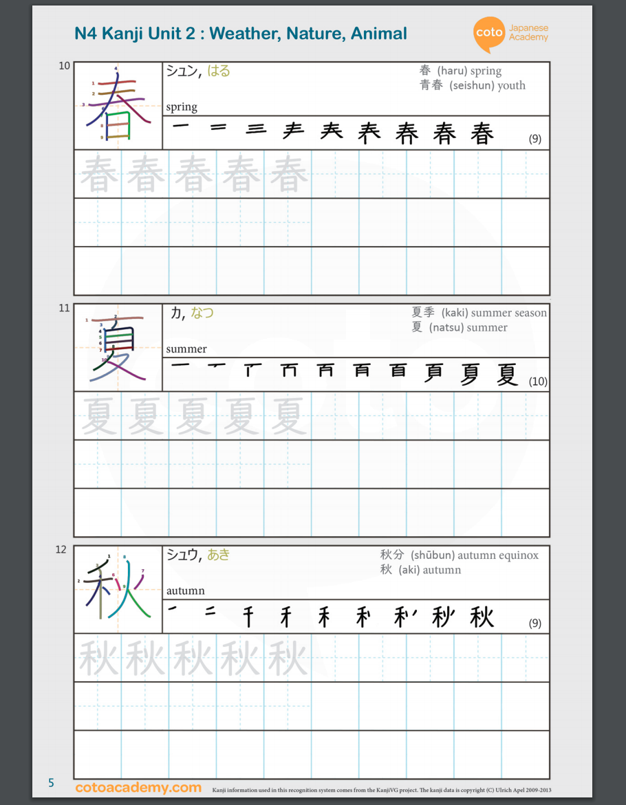 Use these series of self-check quizzes and our kanji writing workbook to remember Kanji.
